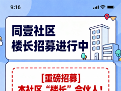 【同壹社区时间银行】楼长招募令—— 守好一栋楼,温暖一群人,成就一份事业——亲爱的邻居:您是否经常帮忙按电梯、代收快递,...