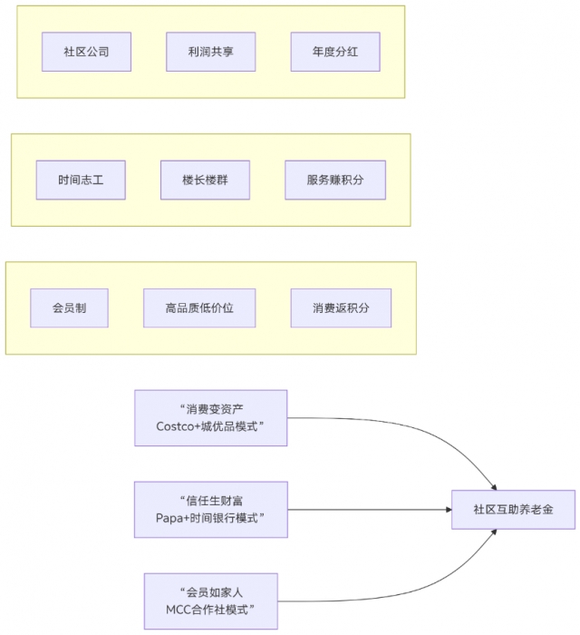 A[“消费变资产 Costco+城优品模式”] --> D[社区互助养老金]
