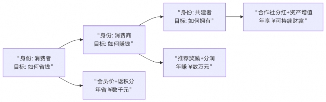 A[“身份: 消费者 目标: 如何省钱”] --> B[“身份: 消费商 目标: 如何赚钱”]