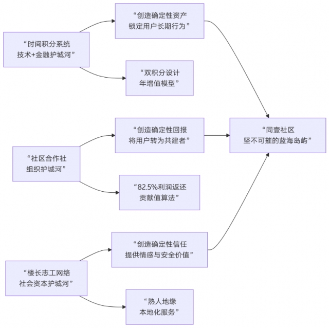 E[“楼长志工网络 社会资本护城河”] --> F[“创造确定性信任 提供情感与安全价值”]