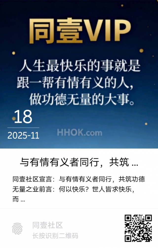 3. 社群共赢: 作为同壹VIP,您是社区的共建者和主人翁。社区整体发展带来的增值收益(如社区基金、共同经营项目),将由全体会员共享。