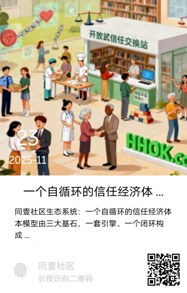 · 同壹实践: 同壹社区就是一个 “因果的显影液” 。你的善良、诚信、付出(因),会通过“时间银行”和“信用合作社”被精准记录,并转化为实实在在的信任资产与财富回报(果)。在这里,修自己的人品,就是在铸自己最坚硬的财富基石。