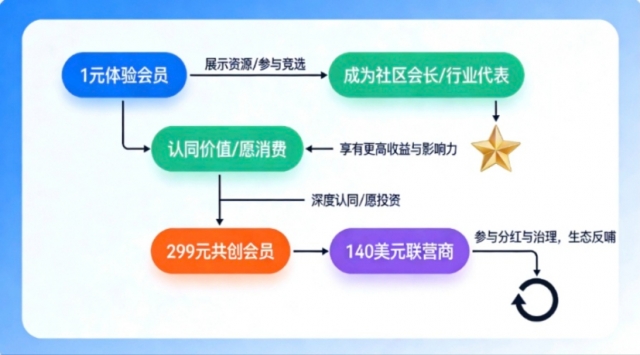 本体系旨在构建一个 “漏斗筛选 + 价值升级 + 身份共生” 的完整成员成长路径。每一级都有明确的门槛、核心权益与上升通道,确保社区生态的活力、质量与凝聚力。