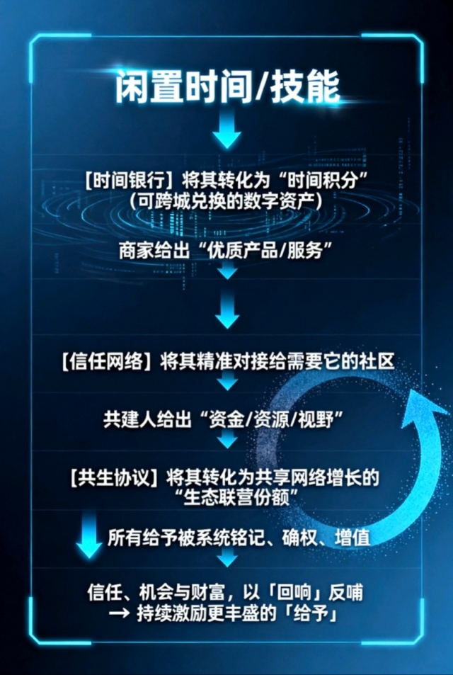 社区居民 | 时间/技能/消费力/邻里联结 | 时间银行/社群活动/会员权益 | 可信生活圈+增值时间资产+归属感