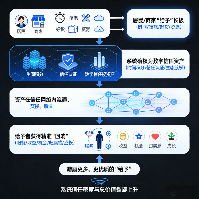 我们设计了一个自我增强的闭环系统,将利他行为系统性地转化为可持续的经济与社会价值。