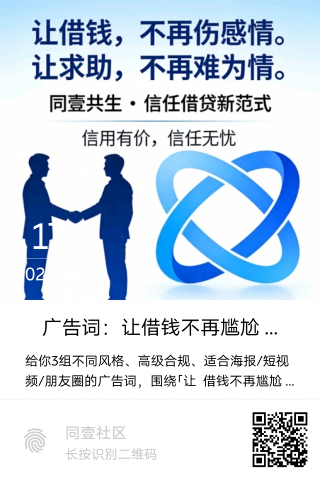 我们在所有培训、所有协议里都强调:同壹不碰钱,只记分。大额资金请走银行,正规借条不能少。 积分是社区内的“信誉分”,是锦上添花,不是雪中送炭。