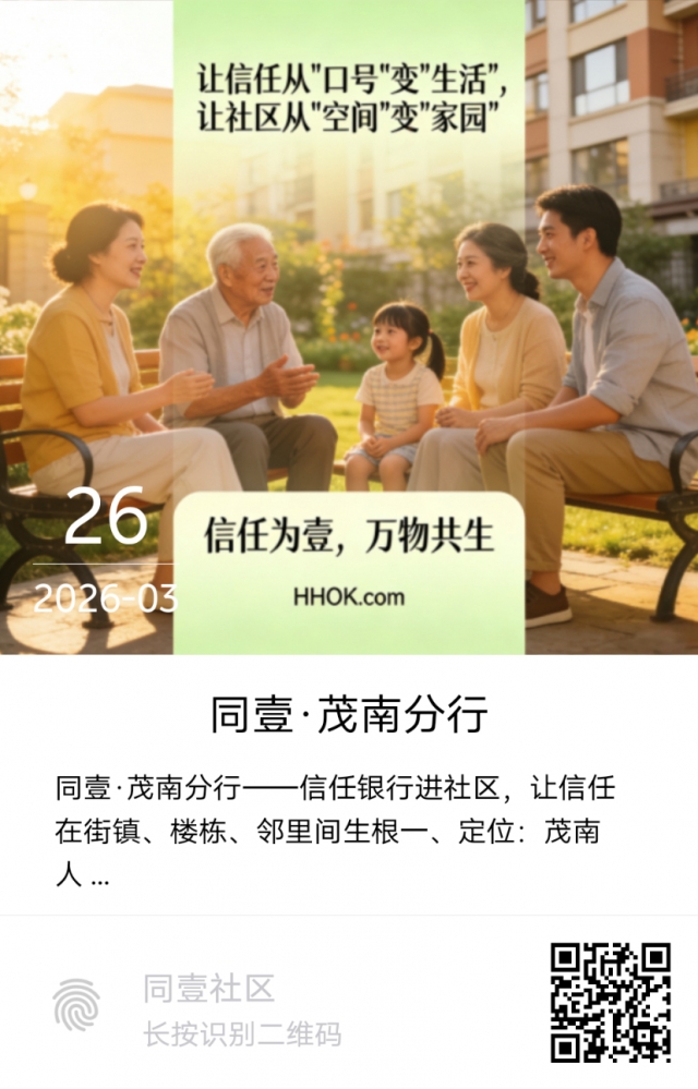 同壹信任银行茂南落地机构,把信任服务送到街镇、社区、楼栋,做真实邻里互助。