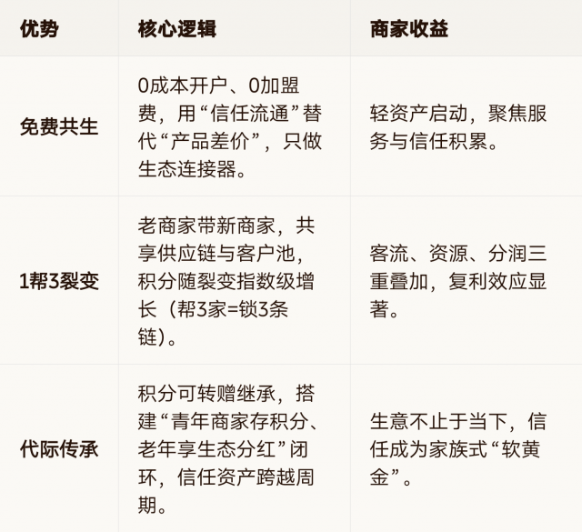 1帮3裂变|老商家带新商家,共享供应链与客户池,积分随裂变指数级增长(帮3家=锁3条链)。|客流、资源、分润三重叠加,复利效应显著。