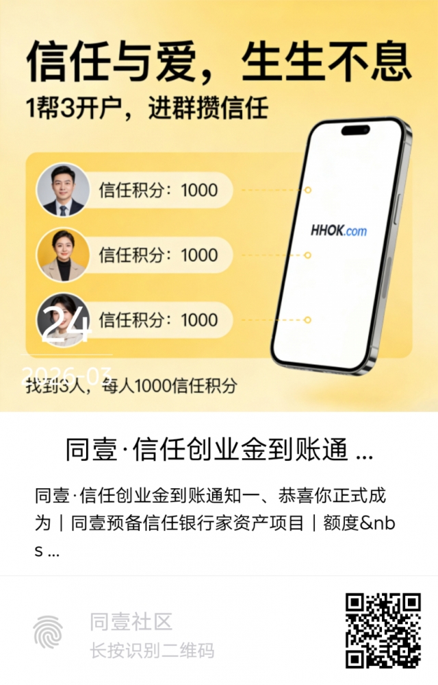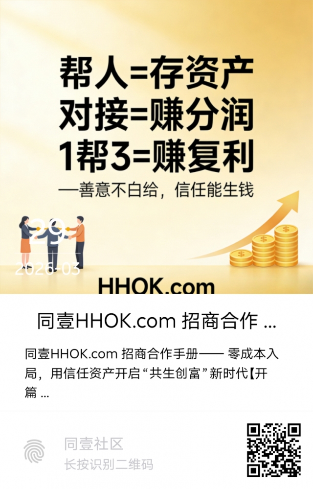 同壹HHOK.com是一场“信任文明”的跃迁实验——从传统“交易文明”走向“信任文明”,让每一份善意都成为可流通、可传承的资产,让普通人零成本实现创业与互助共赢,让商家以“信任力”取代“价格战”,最终构建“我为人人·人人为我”的共生生态。