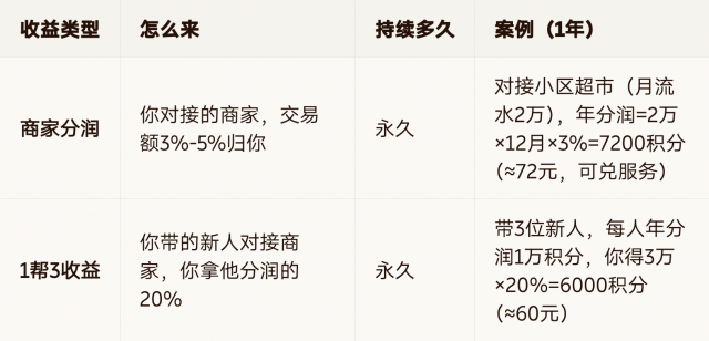 商家分润|你对接的商家,交易额3%-5%归你|永久|对接小区超市(月流水2万),年分润=2万×12月×3%=7200积分(≈7200元,可兑服务)