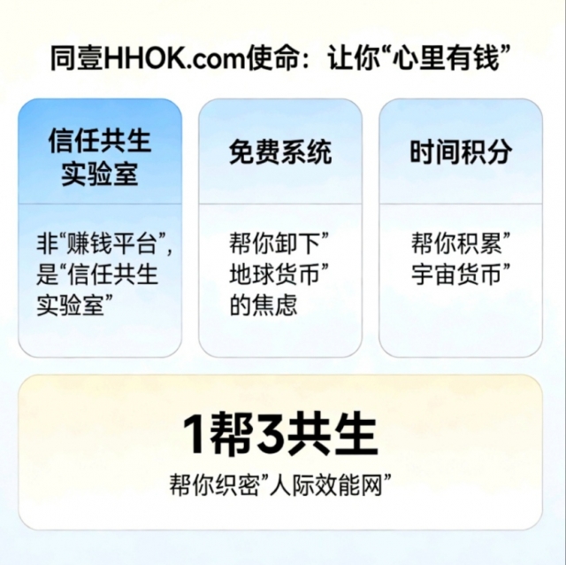 同壹不是“赚钱平台”,是“信任共生实验室”——我们用“免费系统”帮你卸下“地球货币”的焦虑,用“时间积分”帮你积累“宇宙货币”,用“1帮3共生”帮你织密“人际效能网”。