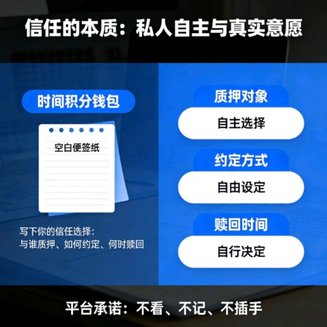 信任的本质是“私人自主”与“真实意愿”。同壹的“时间积分钱包”仅是一张“空白便签纸”,让你写下自己的信任选择——你与谁质押、如何约定、何时赎回,全是你的私事,平台绝不看、不记、不插手。我们相信,在合法框架下,会员间的私人互助能让信任回归本真,而同壹只做那个“不打扰你信任”的沉默工具。