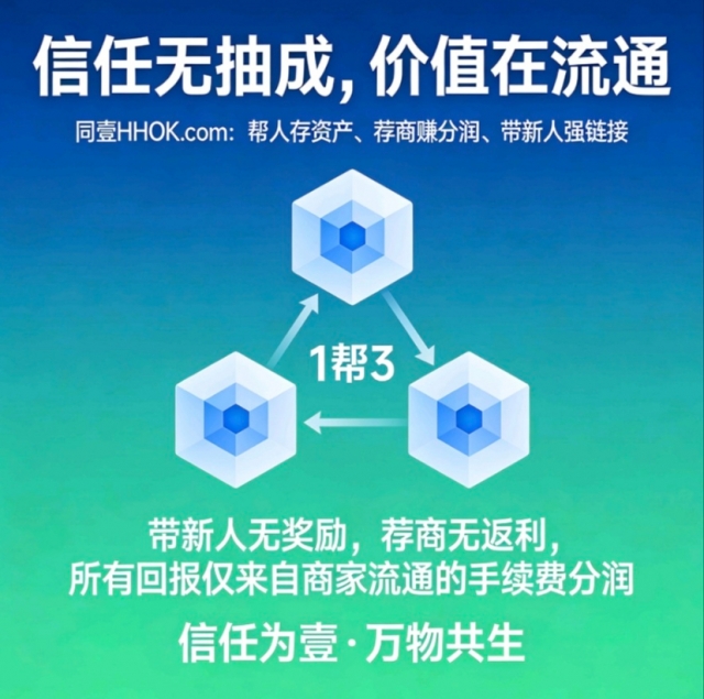同壹用“帮人存资产、荐商赚分润、带新人强链接”,让信任从个人善意变成“1帮3”裂变的生态能量——带新人无奖励,荐商无返利,所有回报仅来自商家流通的手续费分润。1帮3裂变的是信任网络,积累的是链接力信任值,最终实现“信任为壹·万物共生”。