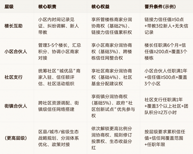 按“楼长互助-小区合伙人-社区支行-街镇合伙人-区县分行-城市合伙人-省级合伙人”七层级晋升,层级越高,分润协商权、生态权益越大: