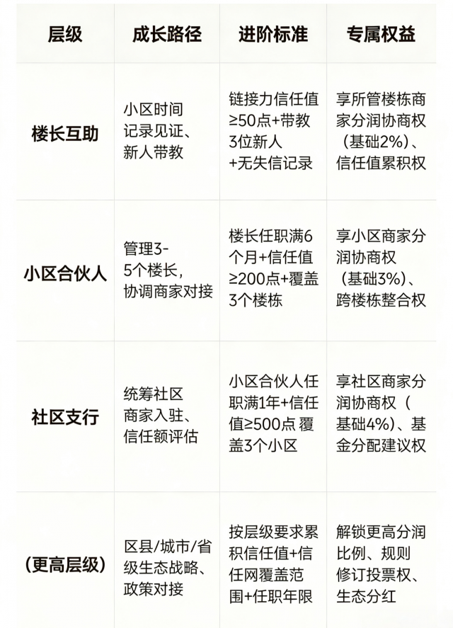 按“楼长互助→小区合伙人→社区支行→街镇合伙人→区县分行→城市合伙人→省级合伙人”晋升,层级越高,分润协商权、生态权益越大。
