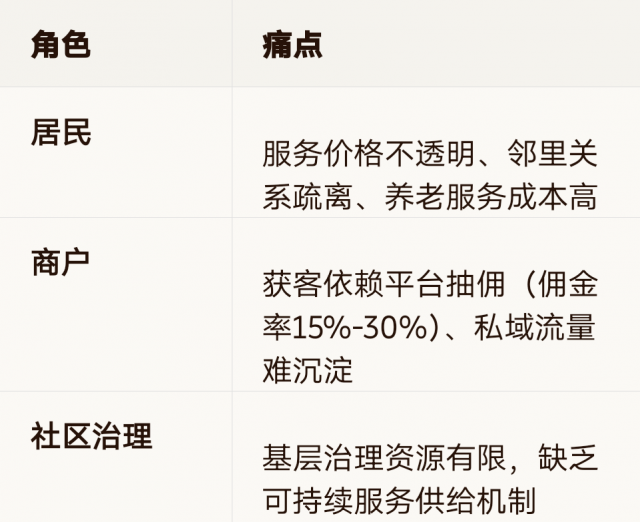 需求刚性:解决社区商业获客难(商户痛点)、服务贵(居民痛点)、信任缺失(社会痛点)三大核心问题;