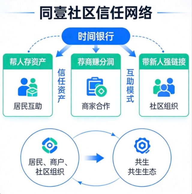 项目定位:同壹社区信任网络是以“时间银行”为核心、以“信任资产”为纽带的社区经济基础设施平台,通过“帮人存资产、荐商赚分润、带新人强链接”的三重互助模式,打造覆盖居民、商户、社区组织的共生生态。