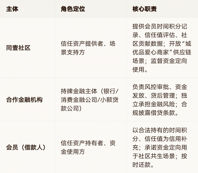 不碰资金:不同业吸收存款、不放贷、不归集资金,借贷资金由合作金融机构直接发放至会员账户;不担风险:不承担借贷违约风险,不参与贷后催收,纠纷由合作金融机构与会员依法解决;不越边界:仅提供信任资产数据(脱敏处理后)、社区场景证明,不参与风控审批与合同条款制定。