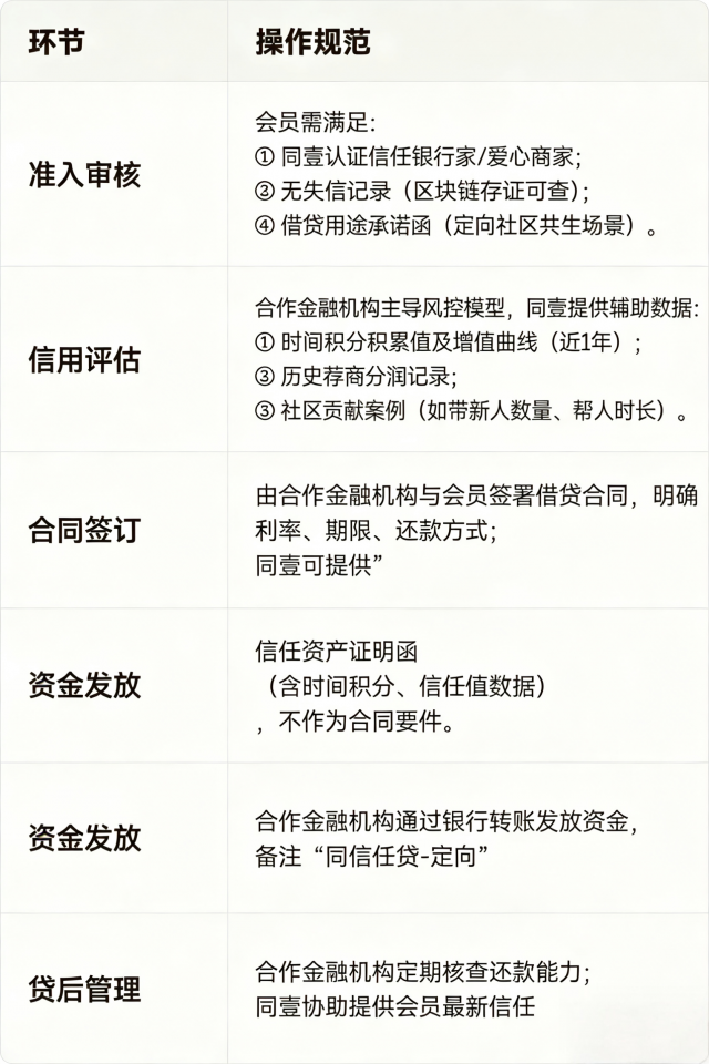 指同壹会员(含社区爱心商家、信任银行家)以“时间积分”积累值、“链接力信任值”、“社区共生贡献” 作为信用补充依据,通过合作金融机构获得短期经营性借贷的服务。借贷资金定向用于社区商业周转(如爱心商家进货、信任银行家拓展服务),还款来源为商家流水、分润收入或个人信任资产变现。