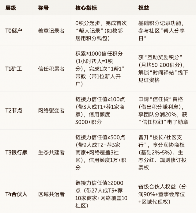 T3银行家|生态共建者|链接力信任值≥500点(带9人成T2+荐3家商家+网络覆盖3社区),信用额度1万+积分|晋升“楼长/社区支行”,享分润协商权(基础2%-5%)、生态分红、规则修订投票权