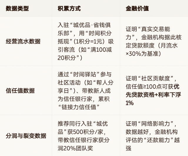 数据先行:商家需先入驻“城优品·爱心商家”、参与“时间驿站”活动,积累可验证的经营数据(流水、积分抵现记录、社区信任值),作为金融对接的“信用门票”;