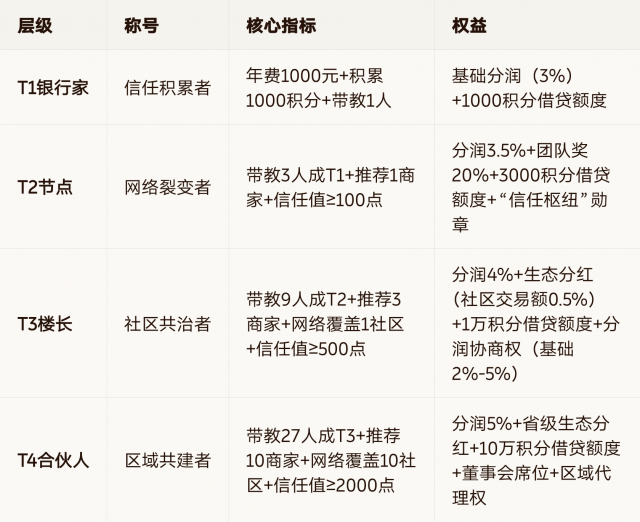 融资支持:流水≥2万+信任值≥100点,对接“信任贷”(年化5%-10%,0抵押,用未来分润质押);