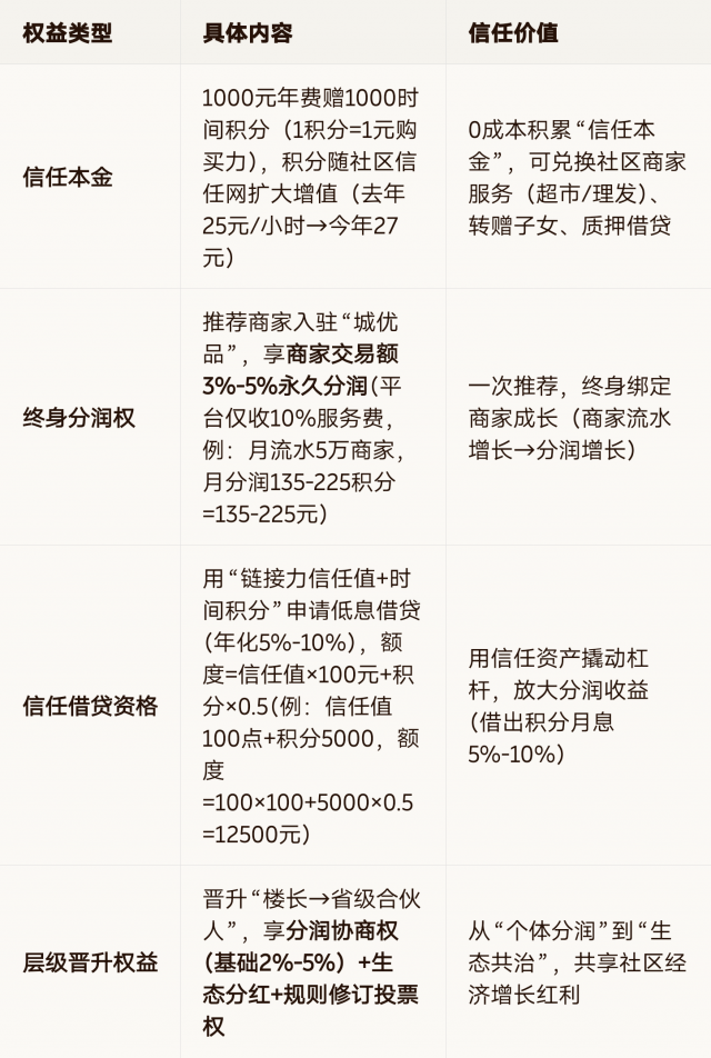 核心价值:从“消费者”升级为“社区信任共建者”,用“时间积分”积累信任资产,用“分润”实现非工资收入。