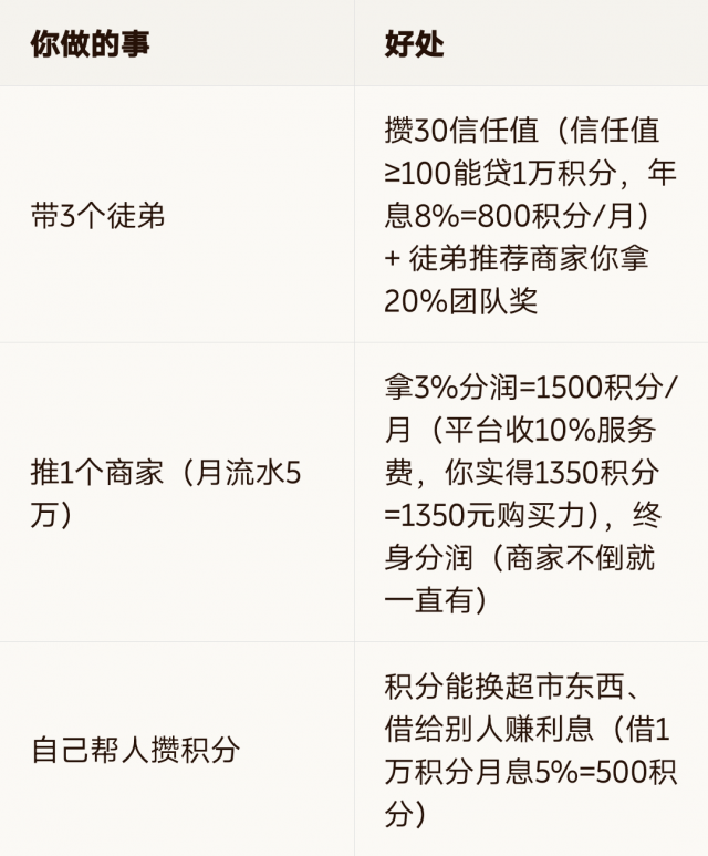 说好处:“跟我做信任银行家,帮人记积分(1小时=1积分),积分能换超市东西、借低息贷款,还能推荐商家赚分润,不用投钱。”
