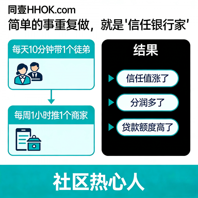 你做的事很简单:带3个徒弟(1帮3),推1个商家,重复做就能攒信任、涨分润、拿贷款资格。