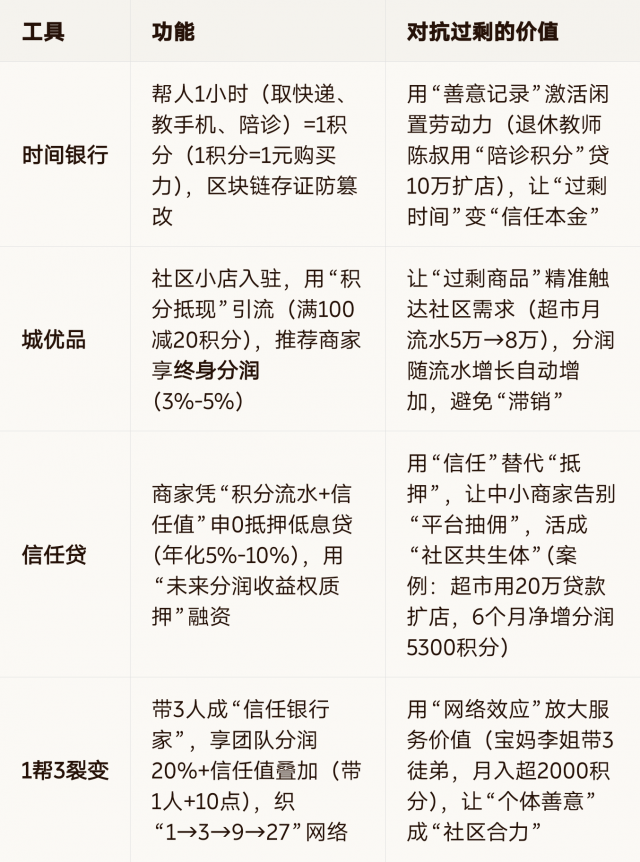 对抗生产过剩:信任资产让“过剩商品”通过“积分抵现”精准匹配需求(如社区超市用积分引流,月流水从5万→8万),避免“鬼城”“滞销”的浪费;