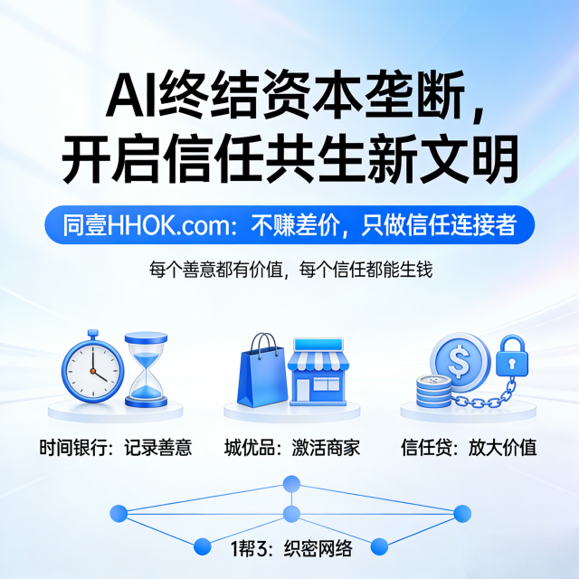 AI会加速一个时代的终结,但终结的是“资本垄断”的旧逻辑,开启的是“信任共生”的新文明。同壹不玩“赚差价”的游戏,只做“信任的连接者”——用时间银行记录善意,用城优品激活商家,用信任贷放大价值,用1帮3织密网络,让“每个善意都有价值,每个信任都能生钱”。
