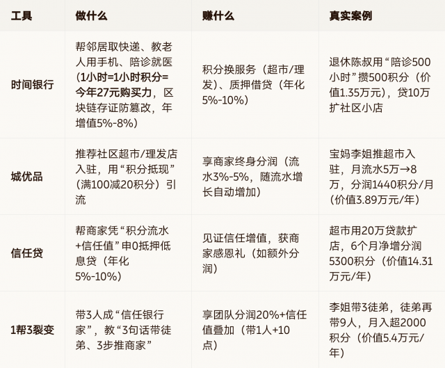 你是社区的“信任连接者”——用“时间银行”帮人攒积分(服务1小时=1小时积分=今年27元时间值购买力,年增值5%-8%),用“城优品”推荐诚信商家(享终身分润),用“1帮3裂变”带教新人(织信任网络),最终成为“信任资产的存管员”和“分润的受益者”。