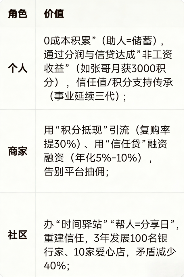 个人|0成本攒“信任本金”(帮人=存钱),用分润+贷款实现“非工资收入”(如李姐月入2000积分),信任值/积分可继承(事业传三代);