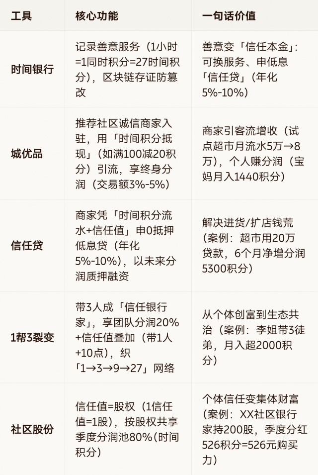 对个人:0成本攒「时间积分」(帮人=存钱),用分润+贷款实现「非工资收入」(如退休陈叔用「陪诊500小时」攒13500积分,贷10万扩店),积分可继承;