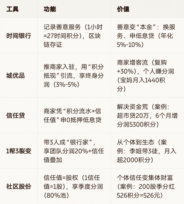 核心价值:让个人0成本攒“信任本金”(帮人=存积分),让商家告别高抽佣(用积分引流+低息贷),让社区重建信任(降低交易成本)。