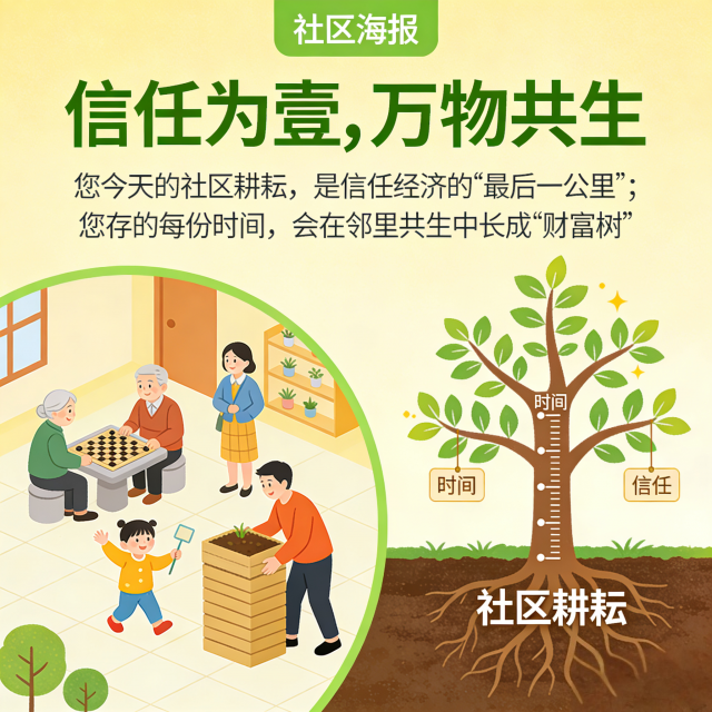信任为壹,万物共生——您今天的社区耕耘,是信任经济的“最后一公里”;您存的每份时间,会在邻里共生中长成“财富树”。