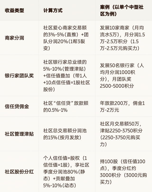 收益多元化:分润(商家+银行家)+佣金(信任贷)+津贴(社区管理)+分红(社区股份),月均收益可达5000-20000积分(5000-20000元购买力);