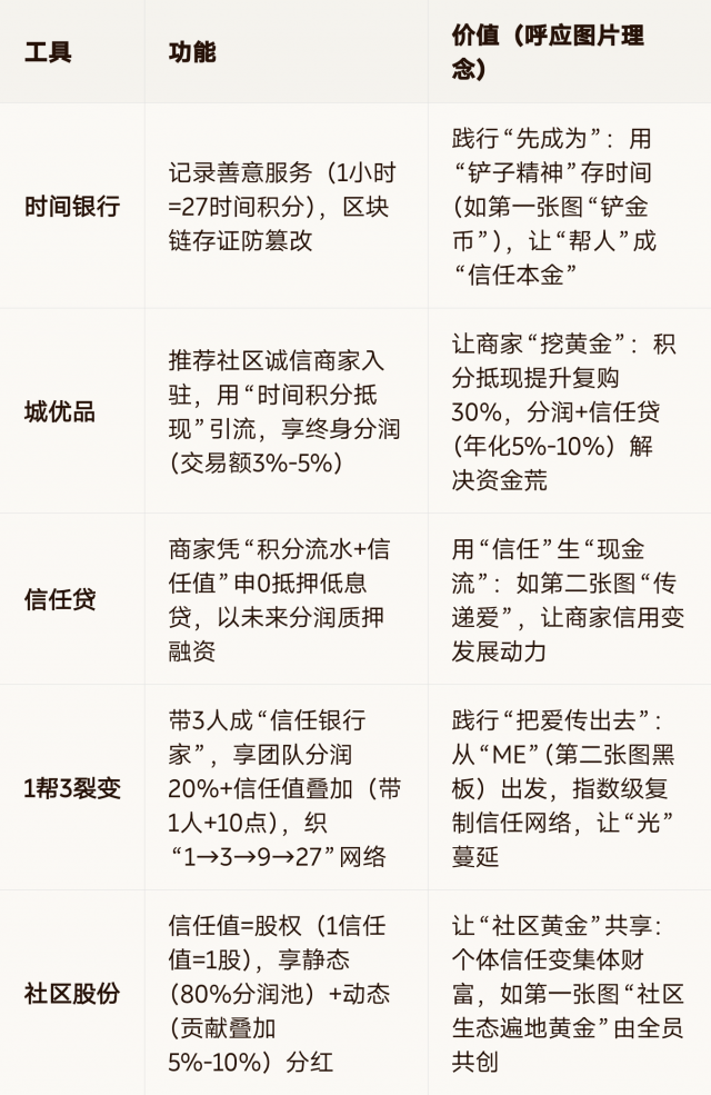 核心定位:全球首家“社区信任资产化”平台,以“时间积分”为纽带,将“善意服务、商家资源、社区网络”转化为可积累、可流通、可传承的信任资产,让“社区生态遍地黄金”从愿景变为现实。