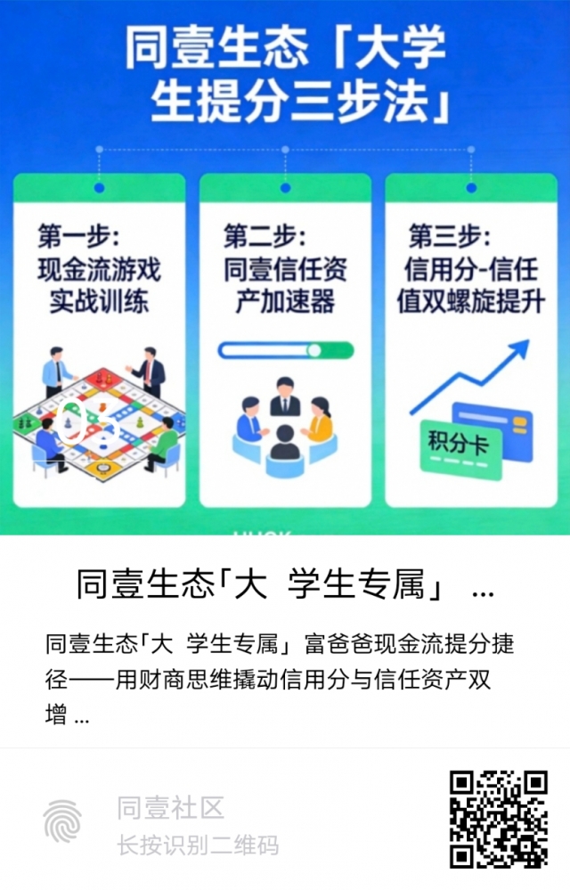 输出经验:在同壹“信用沙龙”分享你的“困惑-意外-奇迹”故事,获“社区建设者”信任值;