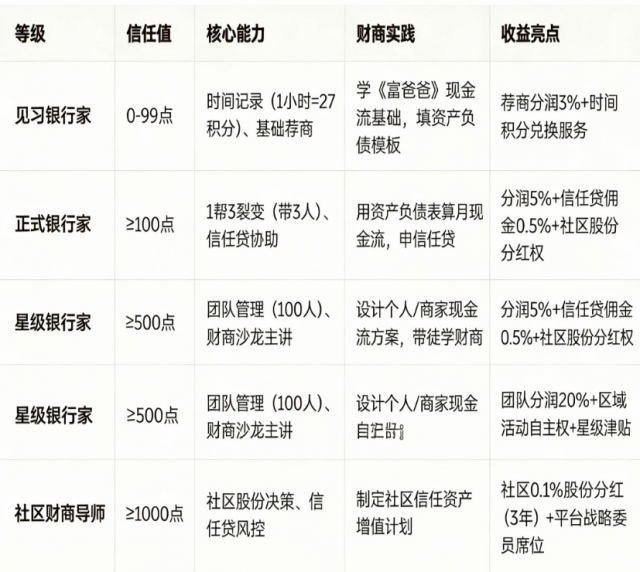信任银行家是社区信任生态的“时间银行家”+“财商引领者”,不赚商品差价,不碰资金池,只通过“帮人存时间、荐商引积分、1帮3裂变信任”,将“善意时间”转化为“信任资产”,用富爸爸财商思维实现个人与社区的共生共富。