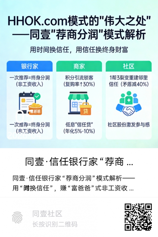 信任同成资产:荐商赚永久分润(3-5%)、1帮3积信任值(兑社区股份)、信任贷盘活商家现金流;