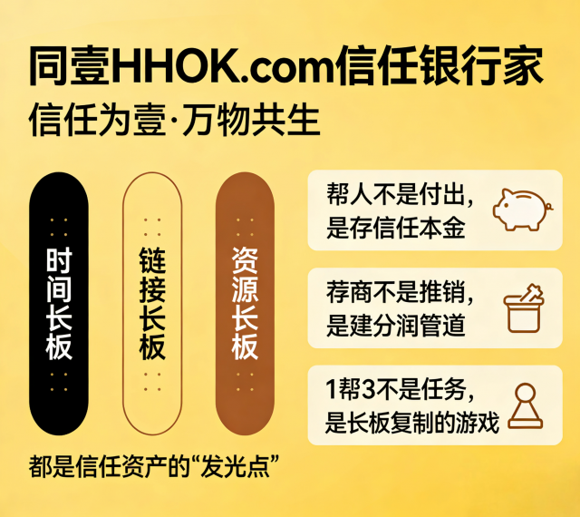 信任为壹·万物共生——您的时间长板、链接长板、资源长板,都是信任资产的“发光点”。在这里,帮人不是付出,是存信任本金;荐商不是推销,是建分润管道;1帮3不是任务,是长板复制的游戏。