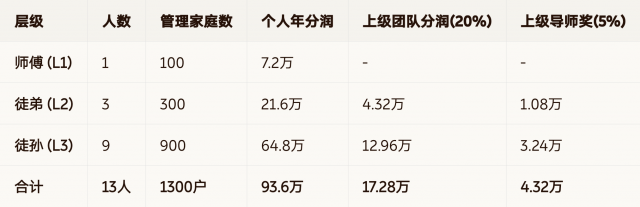 单客经济:1名成熟的信任银行家,通过管理100个家庭的衣食住行消费(月均2000元/户),产生年分润收益3-5万元。裂变引擎:银行家每发展3名徒弟(1帮3),徒弟复制“管理100户”模式,师傅享受20%团队分润+5%导师奖,实现收益指数级增长。