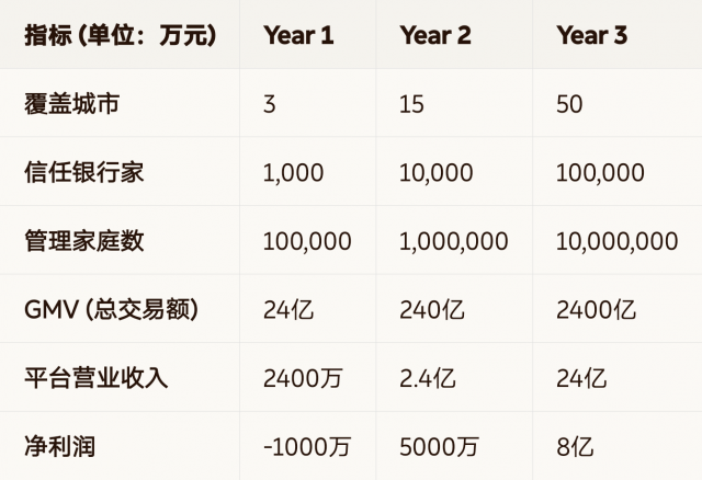 社区股份:银行家可用积分兑换社区便利店/驿站股权,享受分红。信任贷:高信用银行家可申请积分质押贷款,用于创业(如开社区团购店)。8.1 融资金额