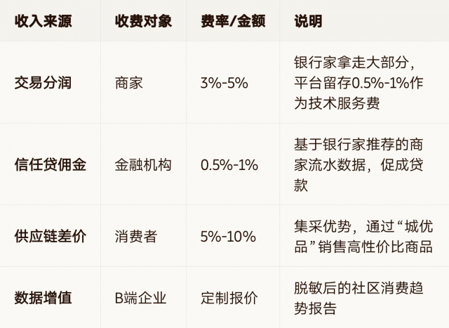 商家赋能:提供SaaS工具,支持“积分收银”,通过银行家网络进行社区地推。供应链金融:基于商家流水和银行家信用,对接持牌机构发放“信任贷”。