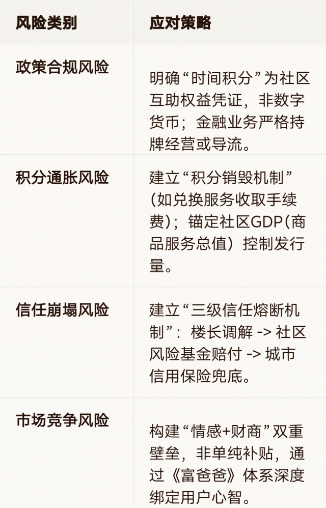 政策合规风险|明确“时间积分”为社区互助权益凭证,非数字货币;金融业务严格持牌经营或导流。