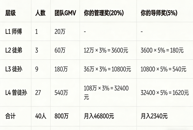 层级|人数|团队GMV|你的管理奖(20%)|你的导师奖(5%)