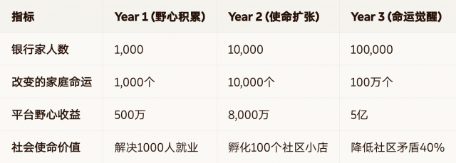 目标:3年覆盖1000社区,拥有10万信任银行家。