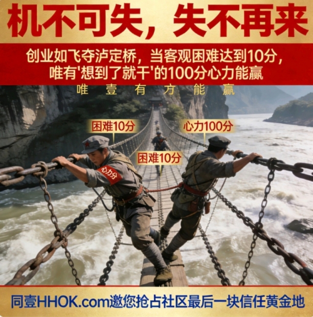创业如飞夺泸定桥,当客观困难达到10分,唯有“想到了就干”的100分心力能赢。