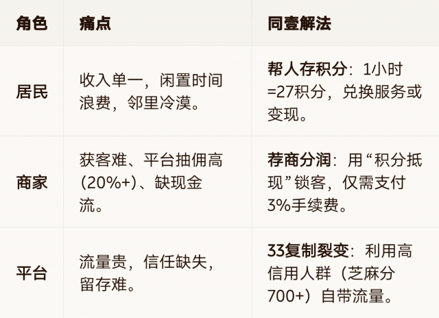 不赚差价,不做自营。利用芝麻信用分作为信任基石,通过“1帮3”裂变模式,将社区家庭消费转化为可继承、可流通的信任资产。